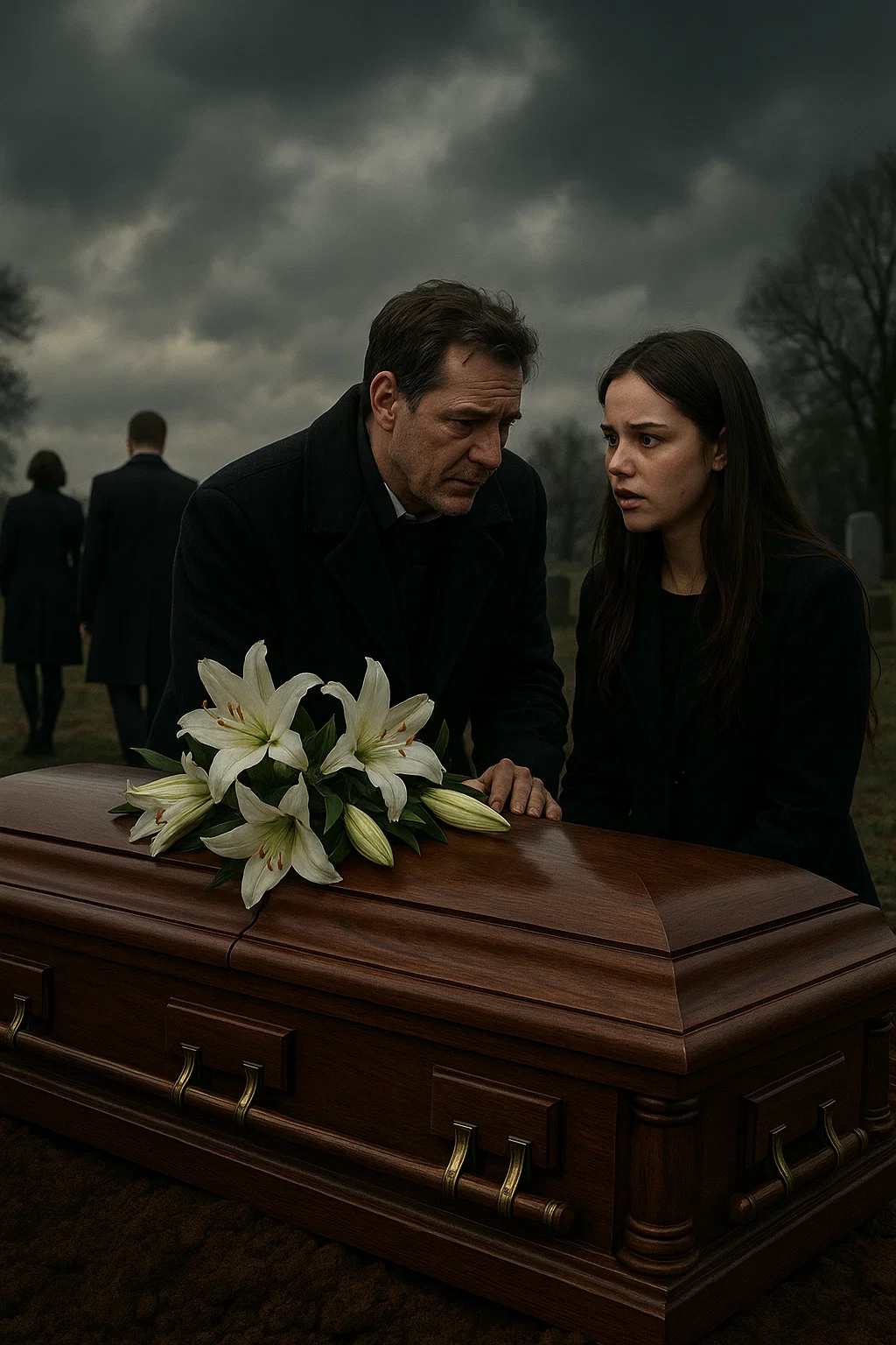 The rain had stopped just before the burial, but the ground was still soft and slick beneath our shoes. I stood near the casket, the smell of damp earth heavy in the air, clutching a tissue I hadn’t used. My father’s coffin gleamed under the gray sky, the lilies on top dripping with rainwater. The pastor said his final words, the crowd murmured amen, and just like that—it was over. Or so I thought. We lingered by the grave, family and neighbors scattering slowly back to their cars. My mother…