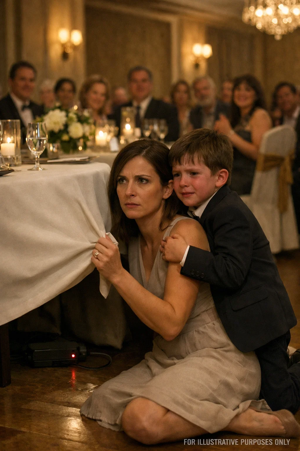 At my sister’s wedding reception I sat peacefully beside my five-year-old when he suddenly squeezed my hand and begged to leave; after he warned me to look under the table, I glanced down, froze, and quietly stood in utter sh0ck. If you’ve ever believed weddings were about warmth, laughter, family, and glittering chandeliers reflecting pure happiness, let me tell you—sometimes beneath those delicate white linens and string-lit ceilings hides something colder, darker, and far more dangerous than doubt, because the night my sister got married wasn’t remembered for the vows,…