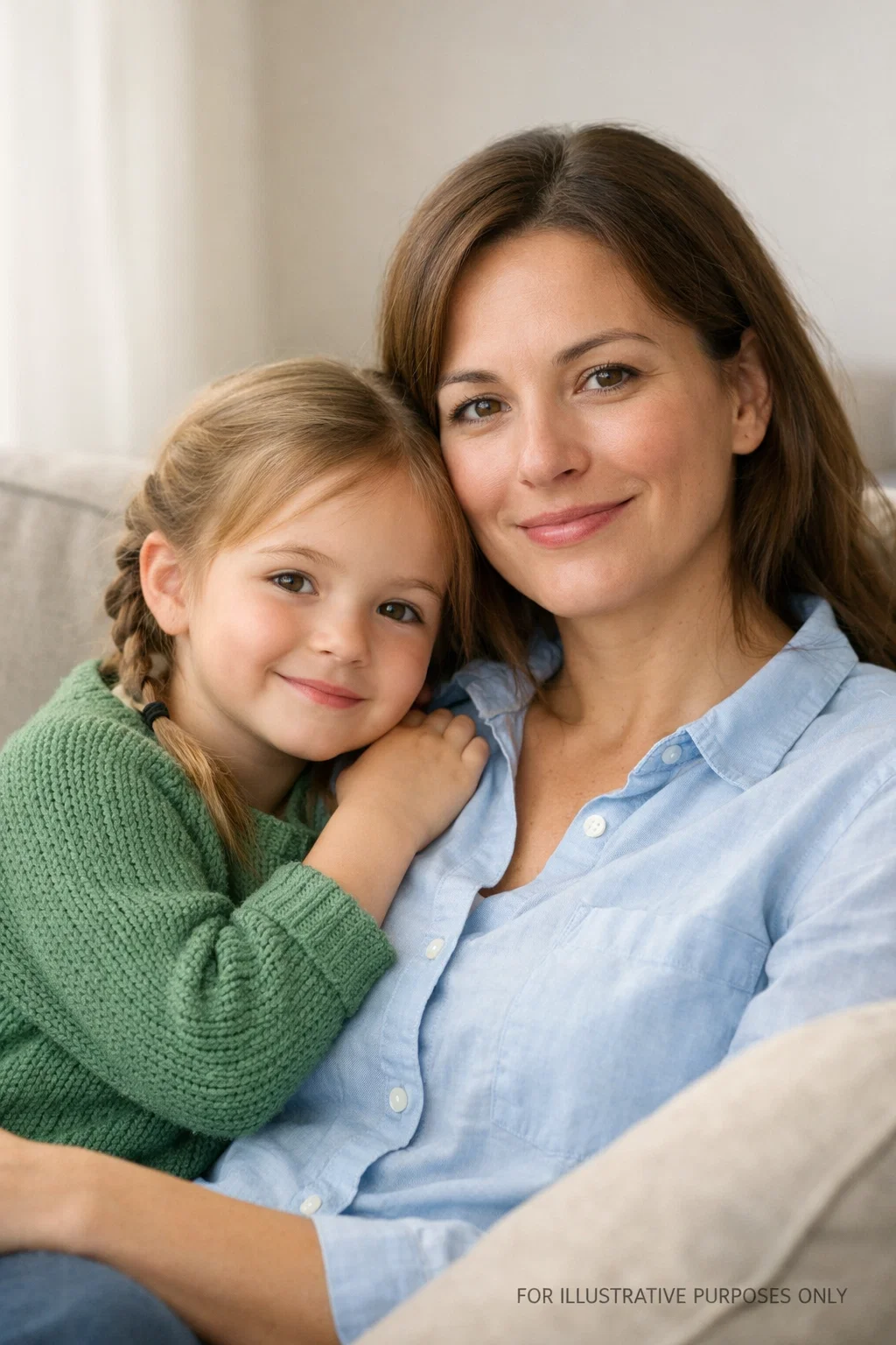 Read MoreScene / environment A two-panel vertical composition. Top panel: An outdoor park or schoolyard setting during daytime. A large tree with green leaves provides partial shade. In the distant background, several children are visible walking or playing, softly blurred, suggesting depth and an active public space. Bottom panel: The front yard of a light-colored suburban house with a porch and greenery. The front door is open, and the setting appears calm and residential in natural daylight. Main subject(s) Adult male (appears in both panels): Gender: male Age: adult (approx. 30s–40s) Skin tone: light Hair: dark brown, short, neatly styled Facial hair: light stubble Facial expression: Top panel: serious, attentive, concerned Bottom panel: warm, gentle smile Child (appears in both panels): Gender: female Age: child (approx. 5–7 years old) Skin tone: light Hair: light brown to dark blonde, shoulder-length, softly wavy Facial expression: Top panel: sad or hesitant, eyes downcast Bottom panel: relaxed and smiling, looking up at the adult male Supporting characters Top panel: No direct interaction from background figures; children in the distance remain indistinct and out of focus. Bottom panel: Adult female in the background standing in the open doorway of the house. Gender: female Age: adult (approx. 30s–40s) Skin tone: light Hair: medium brown, shoulder-length Facial expression: soft smile, calm and observant Clothing & accessories Adult male: Wears a light gray suit with a white dress shirt and a dark tie in both panels. Child: Wears a light blue short-sleeved dress in both panels. Top panel: holding a small doll tightly against her chest. Bottom panel: holding a bouquet of flowers wrapped in pink paper. Adult female (bottom panel): Wears a light pink long-sleeve top and dark jeans. Body language & emotions Top panel: The adult male is crouched or kneeling in front of the child, hands open and extended in a calm, explanatory gesture. The child sits on a stone bench, shoulders slightly hunched, holding the doll close, conveying emotional uncertainty or sadness. Bottom panel: The adult male walks beside the child with one arm gently around her shoulders. The child walks confidently beside him, holding the bouquet, posture relaxed and secure. The woman in the doorway stands upright, watching with a peaceful, supportive demeanor. Lighting & atmosphere Soft natural daylight in both panels. Top panel lighting is slightly diffused by tree shade, creating a subdued mood. Bottom panel lighting is brighter and warmer, enhancing a sense of comfort and resolution. Art style Photorealistic, cinematic storytelling photography. Natural colors, shallow depth of field, realistic textures, no illustration or stylization. Text overlay (mandatory) “FOR ILLUSTRATIVE PURPOSES ONLY” Small Subtle Low opacity Simple sans-serif font Placed unobtrusively in a corner