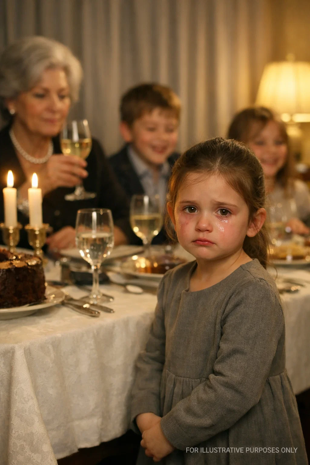 The Sunday dinner table was a minefield set with Mom’s best bone china. The floral patterns on the plates seemed to mock the tension in the room, delicate pink roses blooming beneath the weight of pot roast and unsaid resentments. My daughter, Emma, six years old and small for her age, sat on a stack of cushions, her legs swinging nervously. She had barely touched her glazed carrots, her eyes fixed on the crystal cake stand on the kitchen counter. Inside the dome sat a decadent, three-layer dark chocolate cake, dusted with gold…