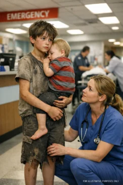 The boy stood just past the threshold, blinking under the harsh fluorescent lights as if he had crossed into another world, his shoulders drawn inward, his thin arms wrapped protectively around a toddler who hung against his chest like the last fragile piece of a life already cracked too many times. His feet were raw and dirty, small cuts filled with dried blood and grit, but he didn’t seem aware of them, or of anything else except the rise and fall—or rather the terrifying lack of it—of the little girl he was holding.