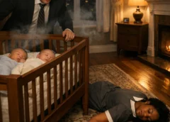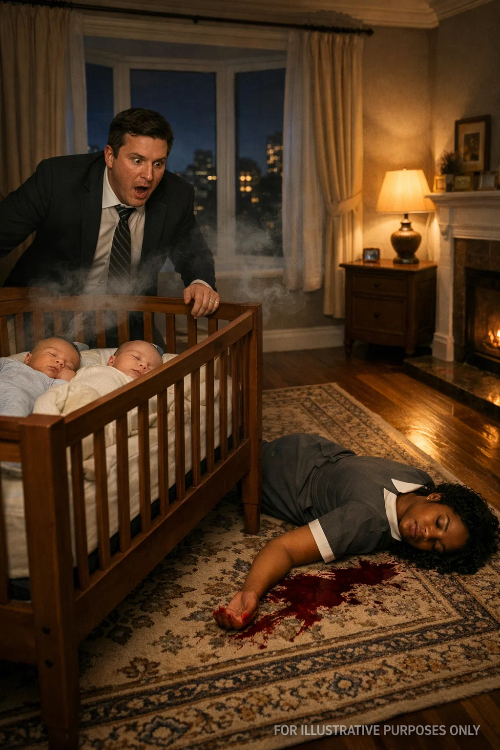 Photorealistic interior nighttime scene inside a well-furnished bedroom or nursery with wooden flooring and a patterned area rug. A wooden crib stands near the center-left of the room, containing two light-skinned infants lying on their backs with eyes closed, appearing asleep, dressed in light-colored baby clothing. Soft smoke or vapor is visible drifting in the air near the crib.