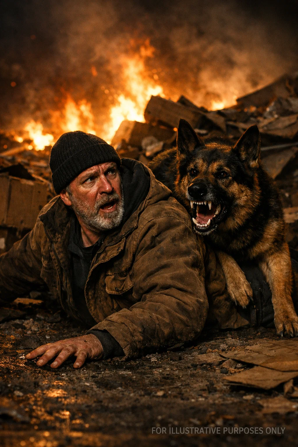 The blast of air knocked him backward. Debris rained down — wood splinters, bottles, chunks of broken pallet. The dog slammed into Tom’s chest, knocking him flat just as a metal shopping cart flew past where his head had been.