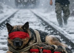 He grabbed a headlamp and moved fast, boots biting into drifted snow. The horn sounded again. Closer. Ethan’s brain did what it always did under pressure: triage, timing, angles. He followed the sound until his light caught a shape on the frozen ballast—an adult German Shepherd, sides heaving, front legs tied with coarse rope. Three small lumps pressed to her chest. Puppies. Their muzzles wrapped in cloth. Their eyes covered.