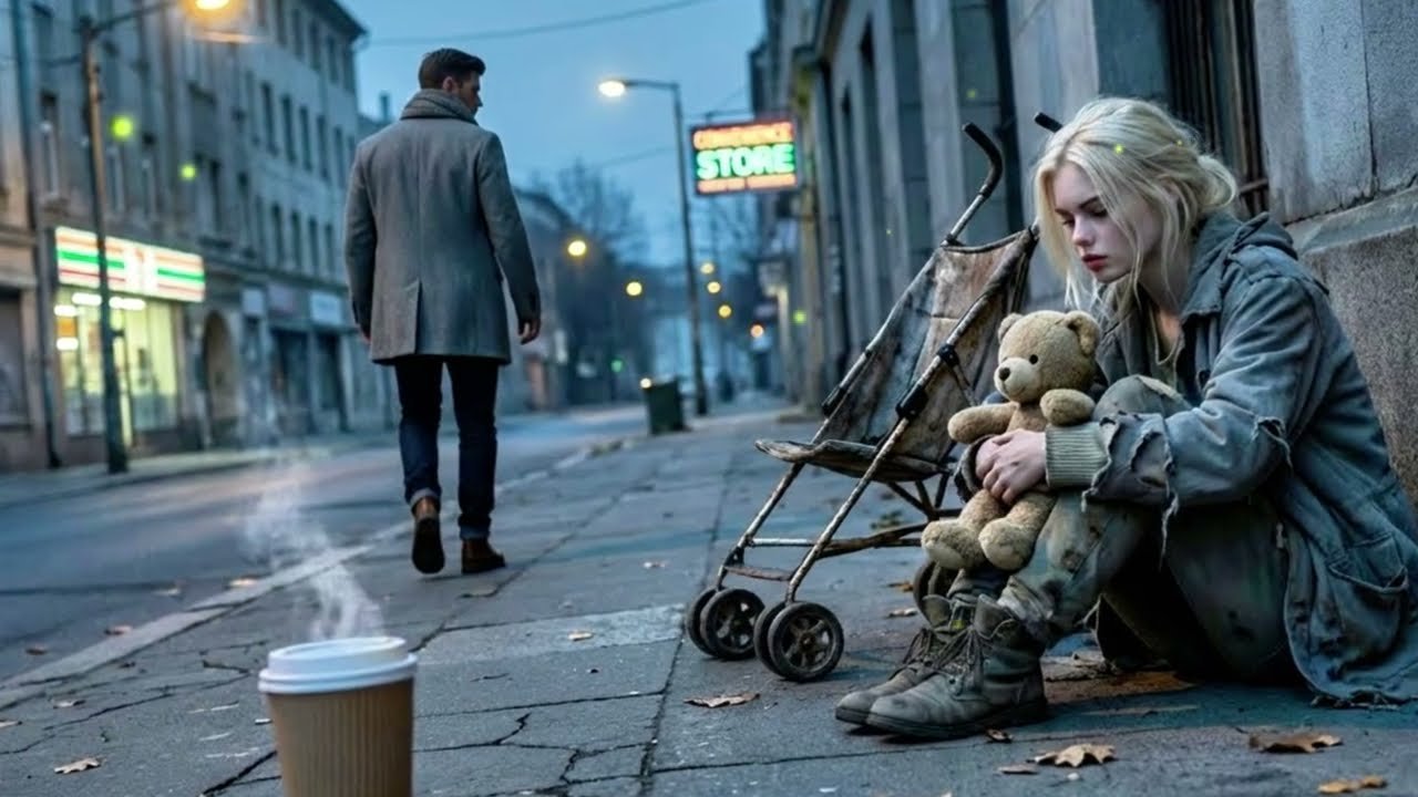 This wasn’t the version of himself people met in boardrooms. This was someone else, a man with questions and a hope he was almost afraid to name. He spotted her in the usual place, sitting on the curb beside the rusted stroller. Same coat, same messy hair, same bear in her arms. She was murmuring softly, rocking slightly, not noticing him at all.