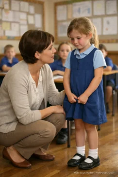 While the other children scrambled for their seats, eager to begin our morning story, Lily stood rigid beside her desk. Her fingers, pale and trembling, gripped the hem of a faded blue dress that seemed a size too large. Her chestnut hair fell in uneven waves, hiding a face that carried a stillness no six-year-old should possess.