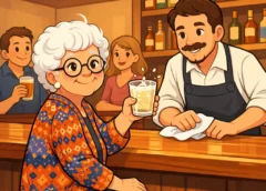 The bartender nodded, poured the drink, and slid it across the counter. As she lifted the glass, she added casually,