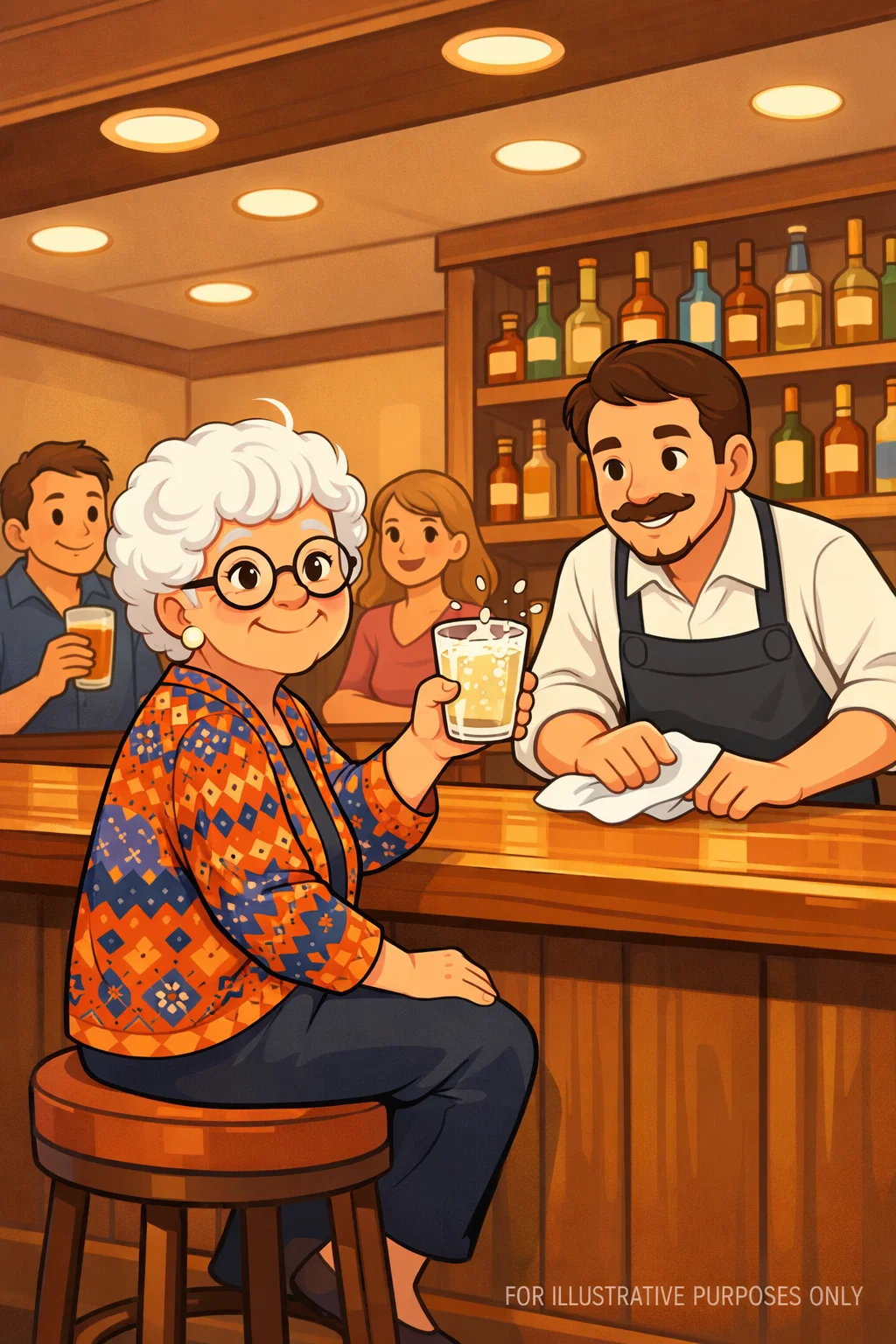 An elegant elderly lady strolled into the bar aboard a luxury cruise ship and settled comfortably onto a stool. With a gentle smile, she said to the bartender,