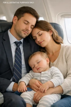 Beside her sat a man in a tailored charcoal suit, silver threaded through his dark hair. He looked out of place on a midnight flight—polished, composed, awake in a way she no longer remembered how to be.