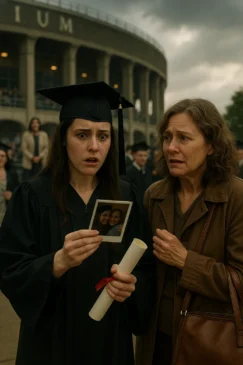 I couldn’t speak. I turned and ran, weaving through the sea of families until I reached my mother. She was hugging friends, her face glowing, still holding a bouquet of roses someone had given her. When she saw me, her smile widened. “Sweetheart! I’m so proud of you!” She pulled me into her arms, but I stood stiff, the photo burning a hole in my pocket.