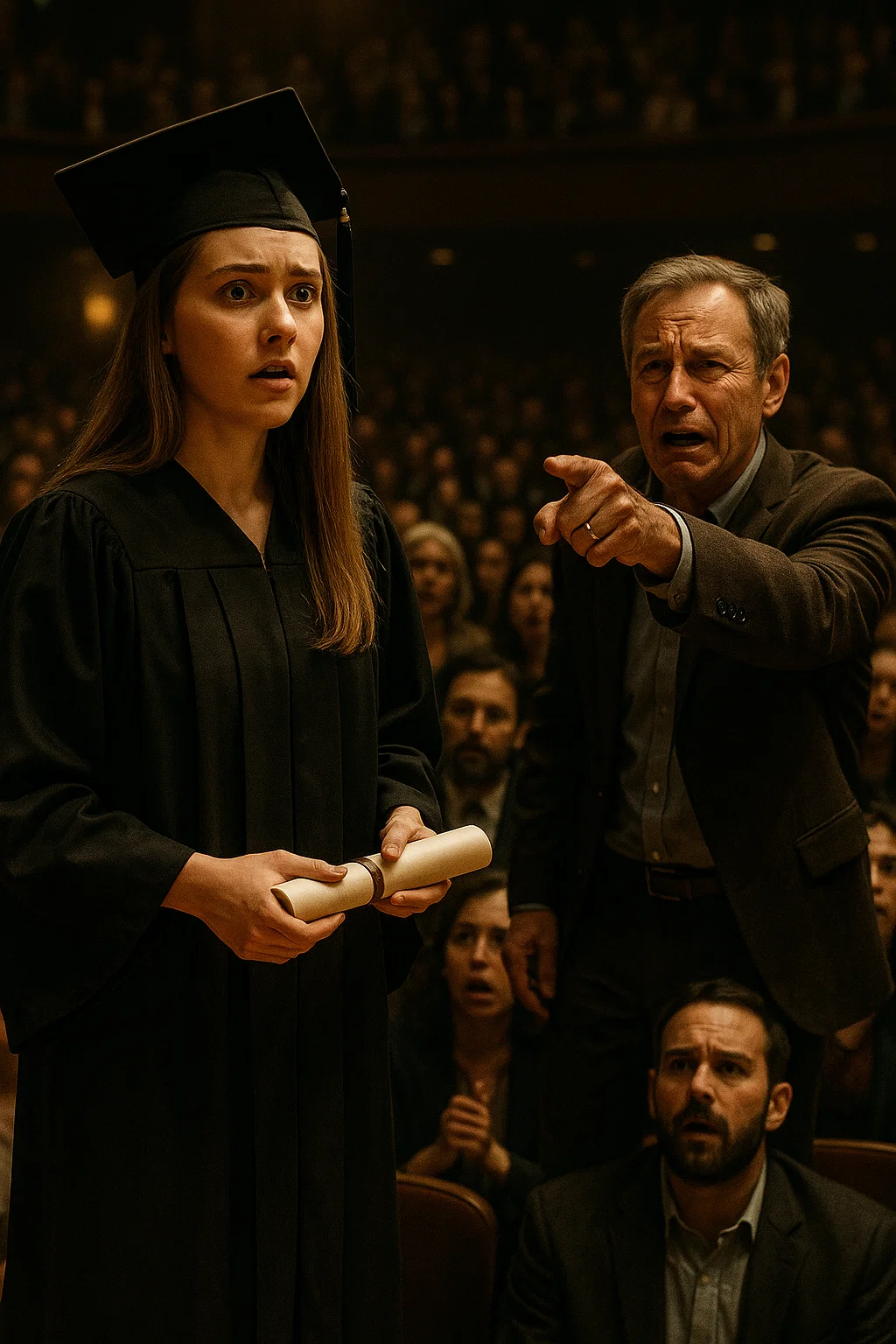 The auditorium fell into stunned silence. My diploma nearly slipped from my hands. For a moment, I thought I’d misheard. But no. His voice was clear, sharp, and filled with a conviction that sliced through me.