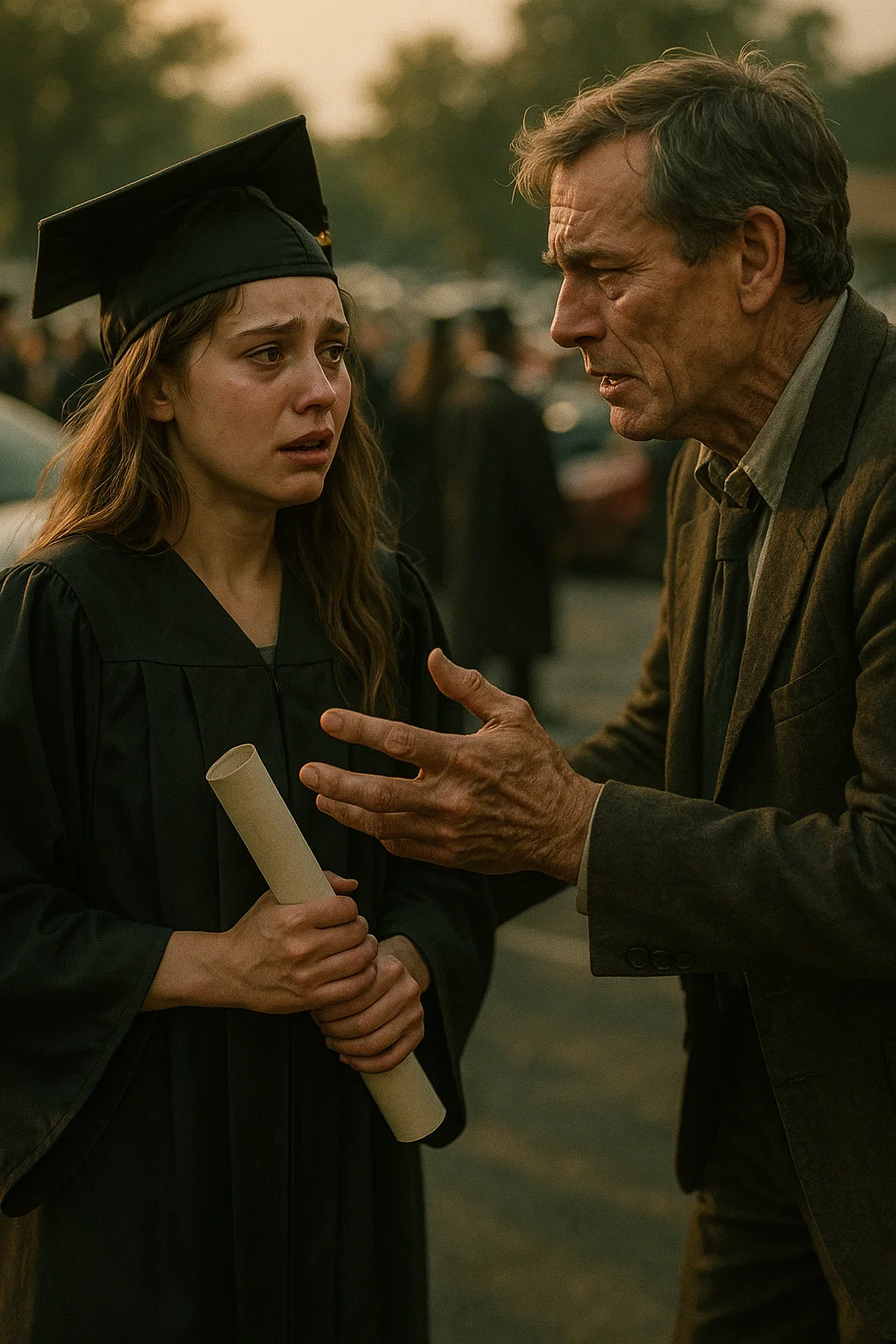 “Congratulations,” he said softly, his voice rough with age and something heavier. I froze, diploma clutched to my chest, because hearing his voice after so many years felt like a ghost had stepped out of my past. My mother appeared beside me instantly, her smile fading, her hand gripping my arm. “Not here,” she hissed at him. “Not today.” But he shook his head, his eyes pleading. “She deserves to know.”