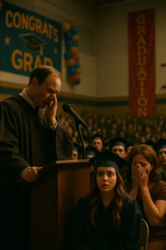 The room erupted. Gasps, whispers, even cries of disbelief echoed off the gymnasium walls. I sat frozen, my cap tilting forward as if even it wanted to hide me. My mother, seated in the front row, went pale. My heart pounded so loudly I could barely hear the chaos around me.