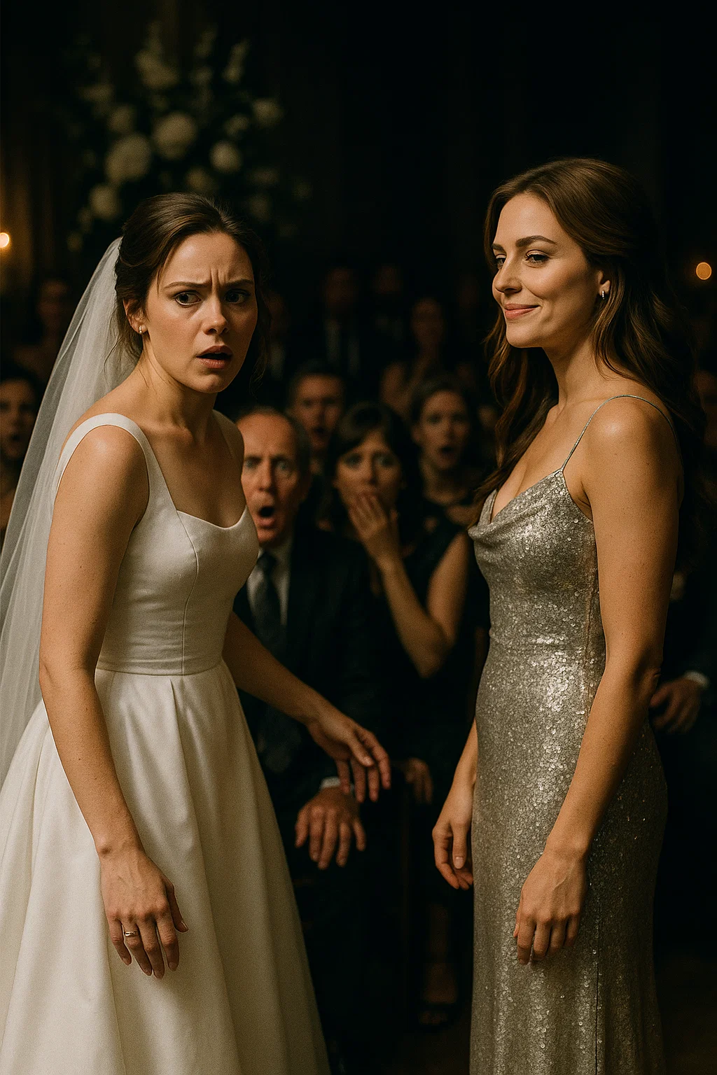 Gasps rippled through the crowd. My stomach plummeted. My father’s mouth fell open. My mother half-rose, as though she could physically stop her. I wanted to scream, but my voice lodged in my throat. Lily’s silver dress glittered under the chandelier as she cleared her throat. “I just want to say something,” she began, her voice steady, clear, rehearsed. My knees trembled.