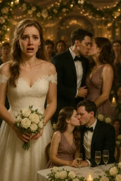 For a second, I thought my vision was playing tricks. The DJ’s music blurred, the chatter dulled, and all I could see was his hand on her arm, her lips pressed against his. Gasps erupted, champagne glasses froze midair, and someone actually screamed. My bouquet slipped from my hand, the petals scattering across the floor as my entire world collapsed in front of every single guest.