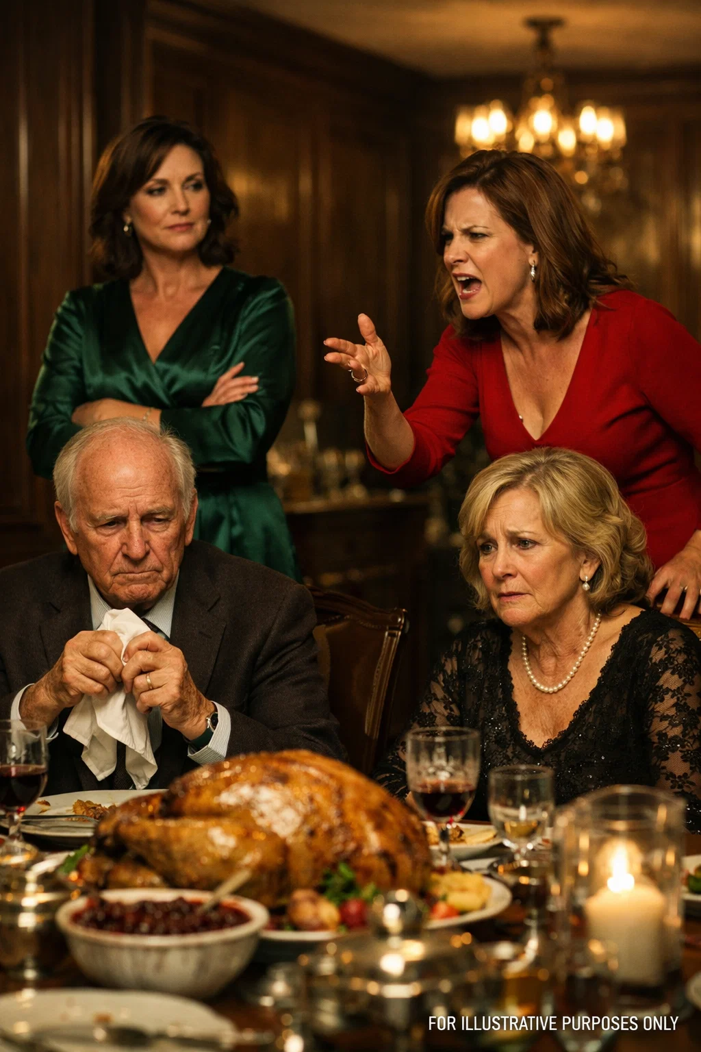 His fork dropped onto his plate with a loud, metallic clatter. The sound echoed like a gunshot. His face went pale, then red, then a sickly shade of grey.