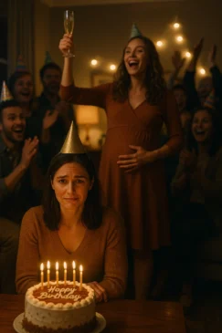 When the last guest left, I sat alone on the couch, the half-eaten cake sagging on the counter, balloons deflating above me. My phone buzzed with tags and posts—photos not of me with candles, but of her holding her belly, glowing.