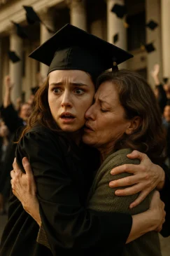 The rest of the ceremony blurred. Friends shouted, cameras flashed, laughter echoed, but I was detached, floating somewhere else entirely. I stared at my mom—no, the woman I thought was my mom—smiling tightly for photos, clapping when my name was called, but her hands shook.