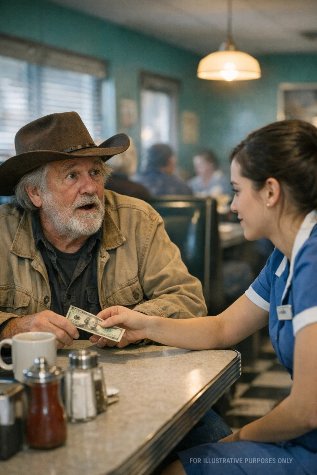 An old, crumpled five-dollar bill slid across the table. It stopped in front of her like a challenge that no one dared to say out loud. The rain lashed furiously against the windows of the almost empty cafe. Naomi Brooks, an African American waitress exhausted from another brutal double shift, looked down at the man sitting alone at table six. It smelled of wet wool and cold nights. Her hands trembled as they circled a chipped coffee cup. To the rest of the world, he was just another old tramp…