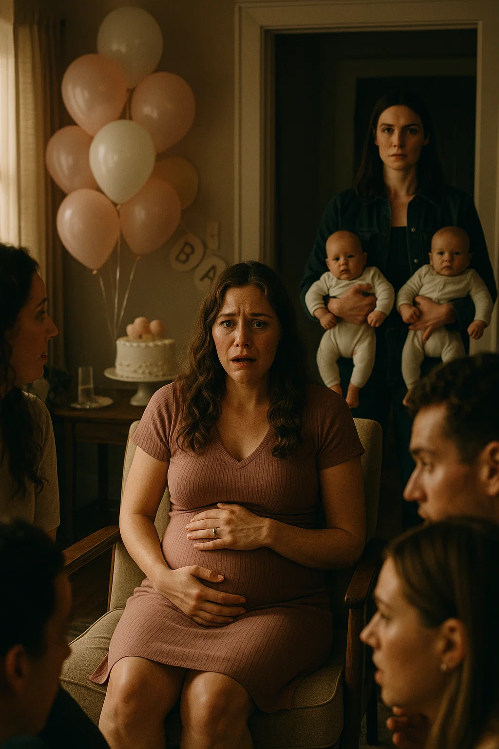 The laughter died the second she stepped through the door. My friends were mid-toast, pink balloons pressed against the ceiling, pastel cupcakes arranged neatly on trays, when the air shifted. At first, I thought she was lost, a stranger who had wandered into the wrong house. But then I saw her eyes lock onto mine—calm, steady, almost daring. And the babies. Two of them. Tiny, sleeping twins cradled in her arms. In that moment, my baby shower was no longer about me. It was about her. And about the man…