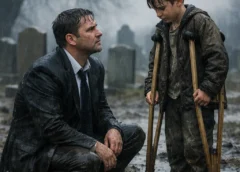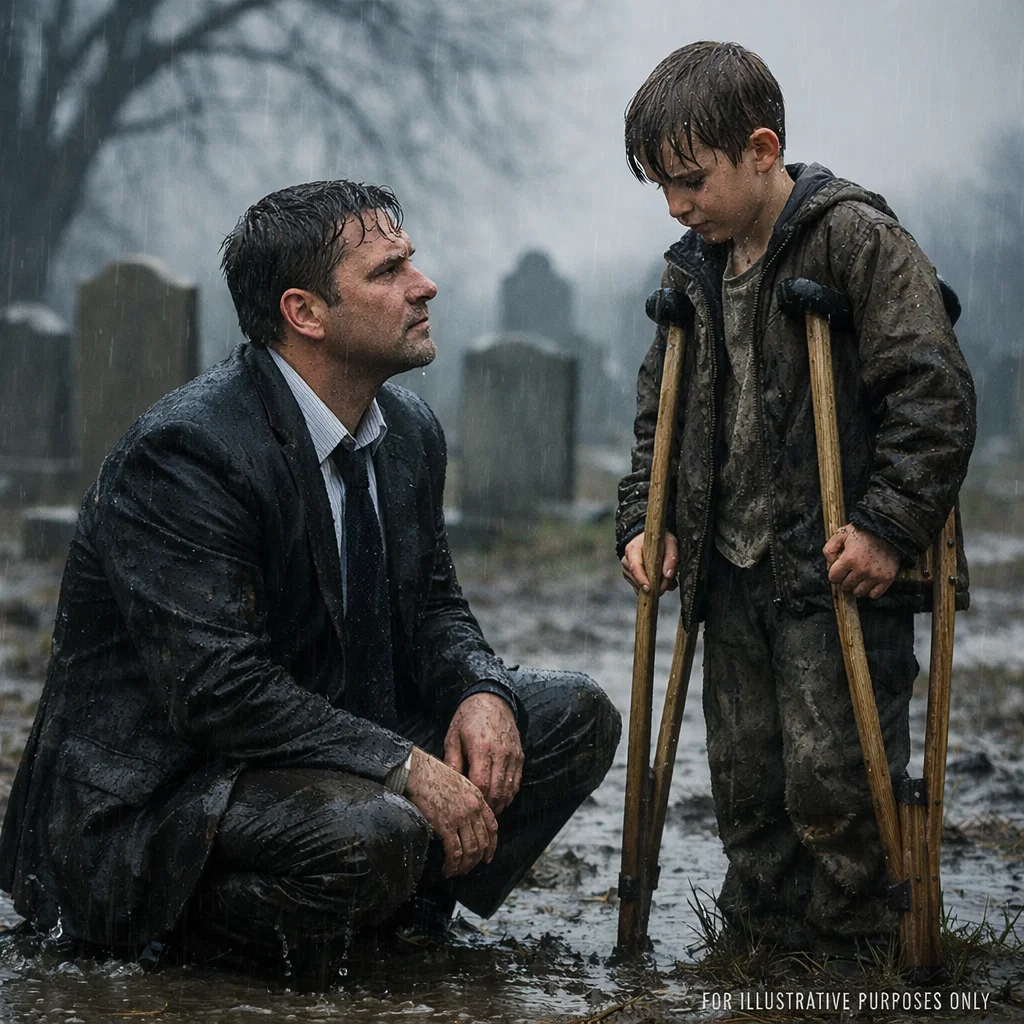 A thin boy, no older than ten, standing awkwardly beside the grave, leaning heavily on a rough wooden crutch that looked handmade, his hair plastered to his forehead by rain, his shoulders hunched not just from the cold but from something deeper, something learned too early.