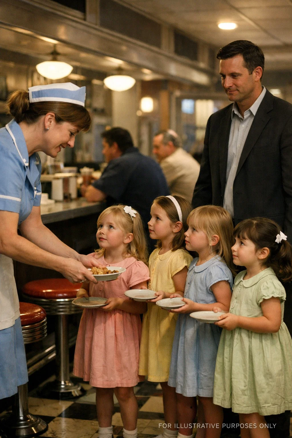 On a rainy night in a small town, a young waitress named Emily Parker noticed four little girls huddled together outside her diner window…