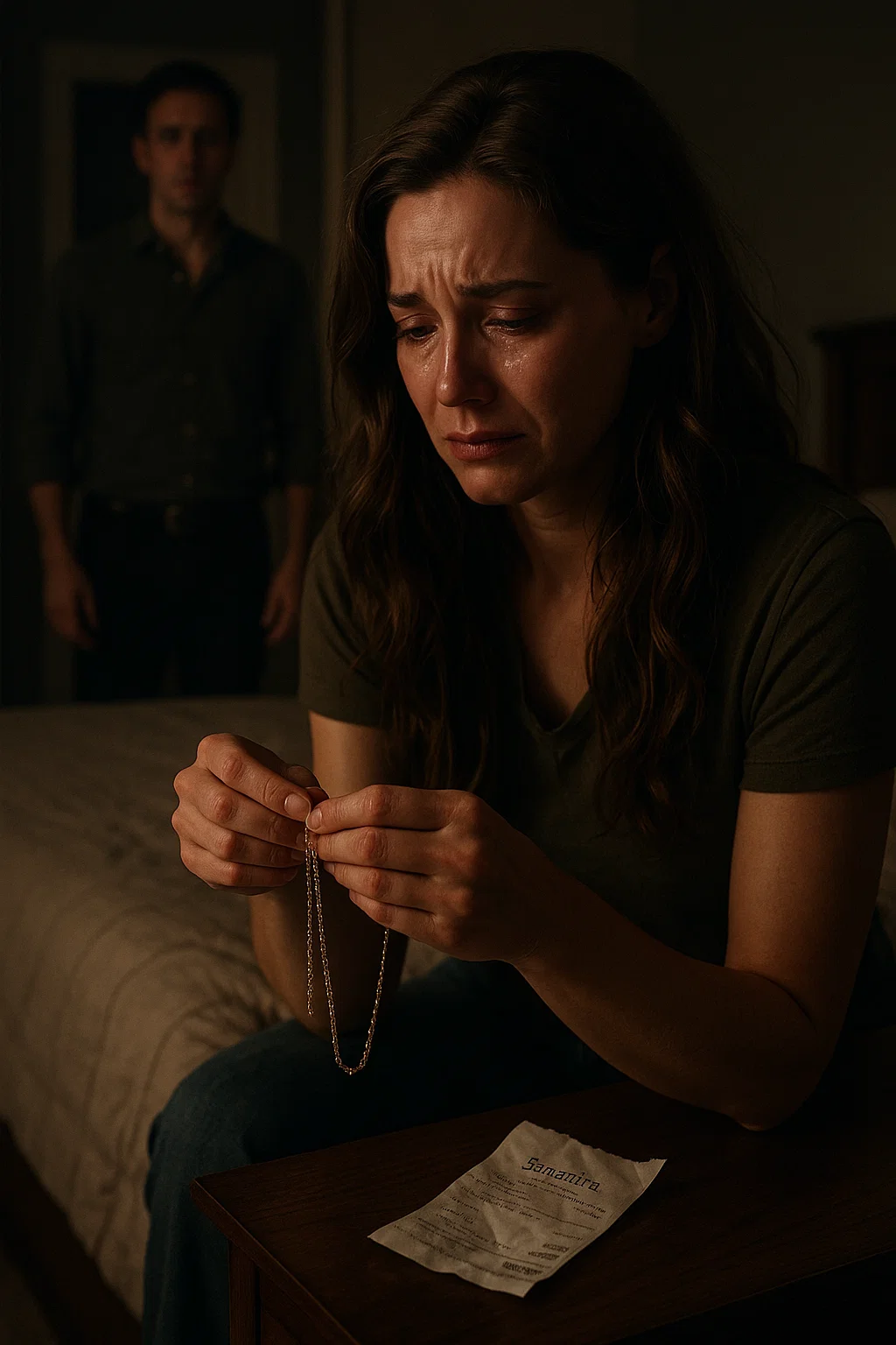 Backstory explains why that single slip of paper shook me to my core. Ethan and I had been married for six years. He wasn’t always romantic, but when he did surprise me, it meant the world. A necklace like this wasn’t just jewelry—it was a symbol, a reminder that he still saw me, still cherished me. I had been telling myself for months that the distance between us was normal, just stress, just life. That night, I thought the necklace proved I was right.