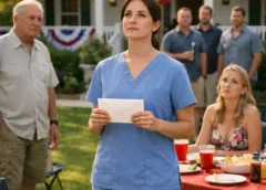 I want to be precise about that choice. I had just come off a twelve-hour shift and I could have changed. I did not change. I wore the steel-blue scrubs with the badge clipped to my chest and the wrinkles at the knees that come from moving fast for twelve hours, and I walked through the side gate into my mother’s backyard in front of thirty-one people who all knew what I did for a living and not one of whom had texted to ask how I was doing.