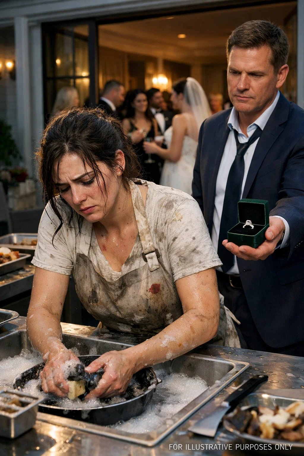 Her hair was tied back loosely. Her sleeves were rolled up. Soap bubbles covered her hands as she scrubbed a heavy pot.