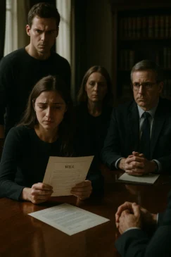 The office was cramped, lined with books that smelled of dust and secrets. My brother Daniel sat beside me, his knee bouncing, while my mother kept her hands folded tightly in her lap, her wedding ring spinning slowly on her finger. The lawyer, Mr. Harris, cleared his throat, his voice as dry as the papers in front of him.
