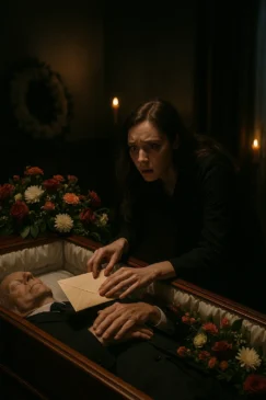 That’s when I noticed it. A corner of cream-colored paper peeking from beneath his folded hands. At first, I thought it was part of the lining, some stray scrap from the funeral home. But the edge was too clean, too deliberate. My pulse quickened. My siblings were behind me, talking quietly, not paying attention. The organ swelled, giving me cover.