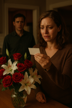 Backstory flooded in. Daniel and I had been married for seven years. Our life wasn’t perfect, but it was stable—or so I thought. He worked long hours, traveled often, but he always came back with stories, souvenirs, and just enough affection to convince me everything was fine. I never suspected him of being unfaithful. I defended him when friends whispered about how distant he seemed, when my sister raised an eyebrow at his “business trips.” I had convinced myself that doubt was poison, that trust was the cure. But now I was standing in my kitchen with roses meant for someone else, a card that shredded the illusion I’d been living in.