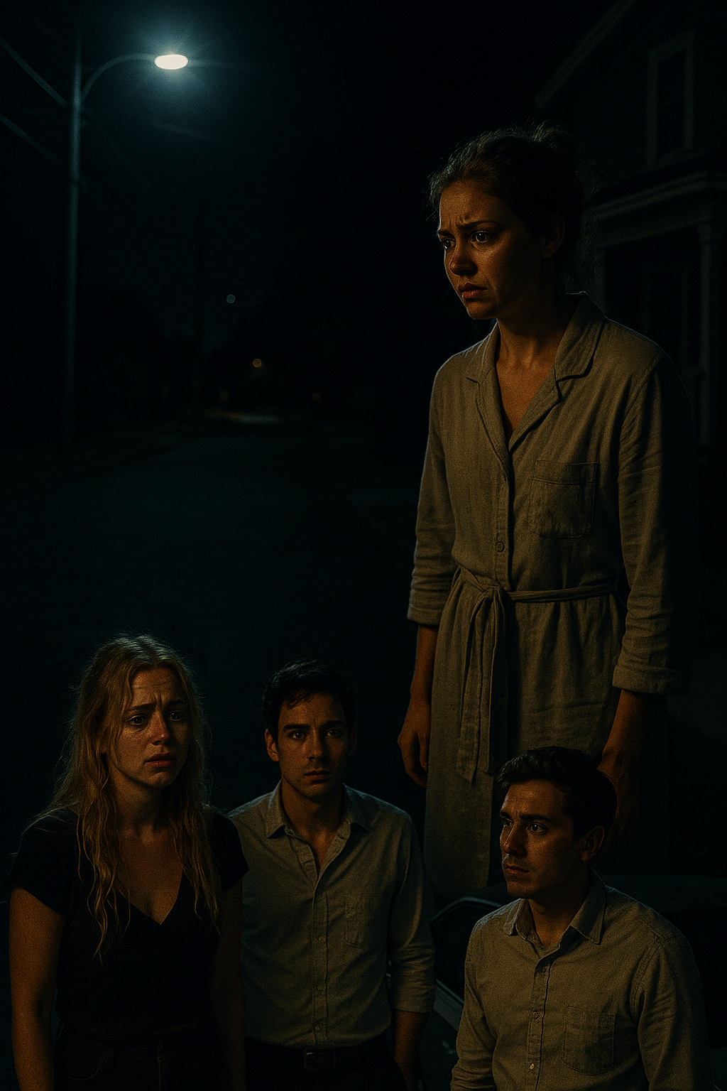 Inside, I leaned against the wood, shaking so violently I thought I might collapse. I heard them outside, whispering, arguing, footsteps retreating to the car. The engine started, headlights slicing through the night. Then silence.
