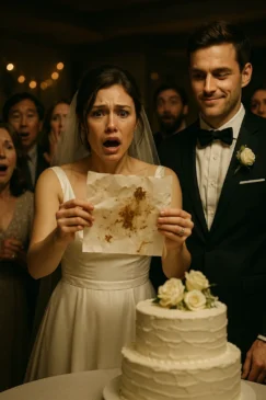 My stomach turned. The crowd laughed, thinking it was part of some quirky wedding stunt. Someone shouted, “What’s it say?” I couldn’t speak. My hands trembled, the paper fluttering like it wanted to escape me.