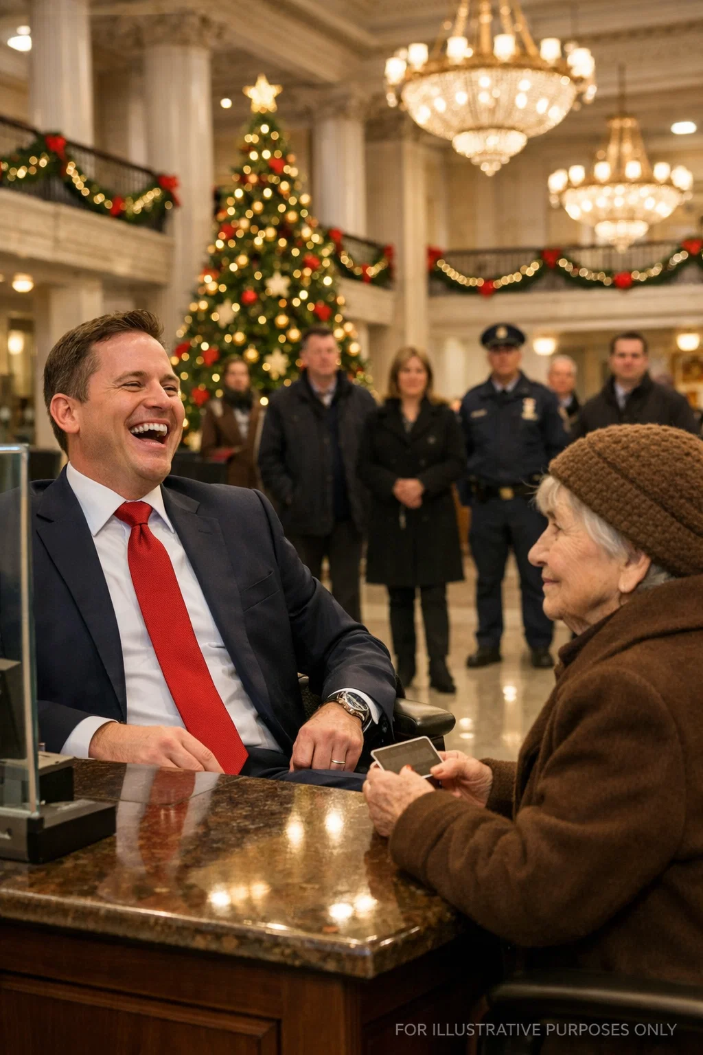 “Ma’am,” he said loudly, making sure the entire lobby heard him, “I believe there’s been a mistake. This is a private bank. Perhaps the small community branch down the street would be more appropriate for you.”