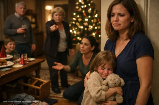 I sat at the far end of the table, near the kitchen door—the drafty spot. Next to me was my seven-year-old daughter, Mia. She was picking at her cold roasted chicken, her small shoulders hunched as if she were trying to make herself disappear.