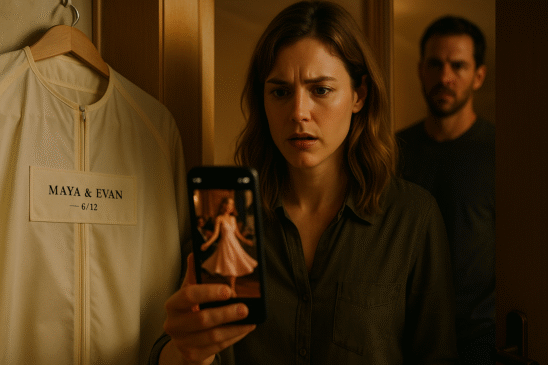 “Did you give Chloe my dress?” I hold up my phone. The photo fills the screen: her as a human exclamation point in my garment, my satin, my private vow on a hanger.