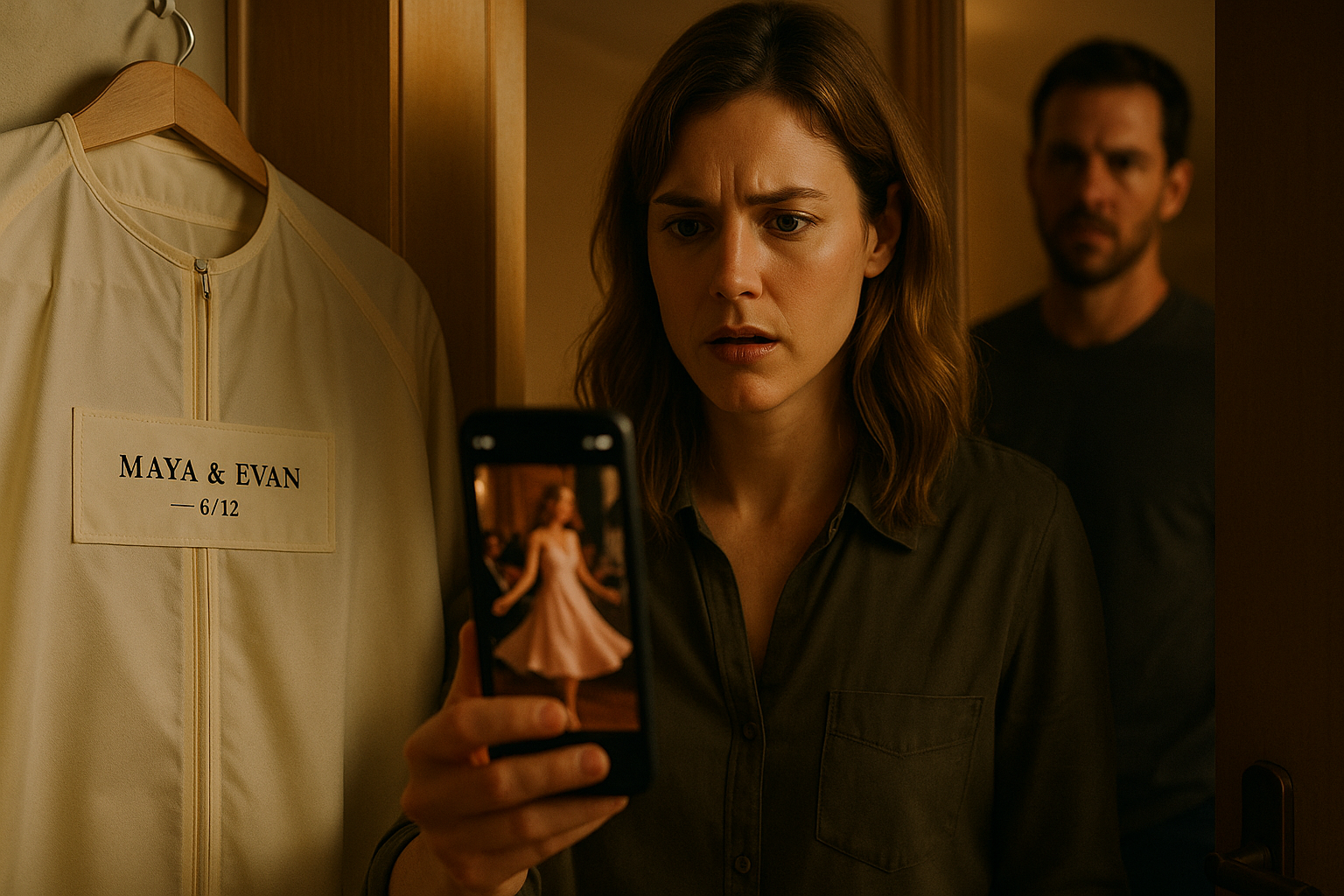 “It’s ours,” I say, voice low, and flip to the Story with the garment bag. I zoom, absurdly gentle with my finger as if I could smudge the truth less by touching it softly. The stitched label is complete. Our names. Our date.