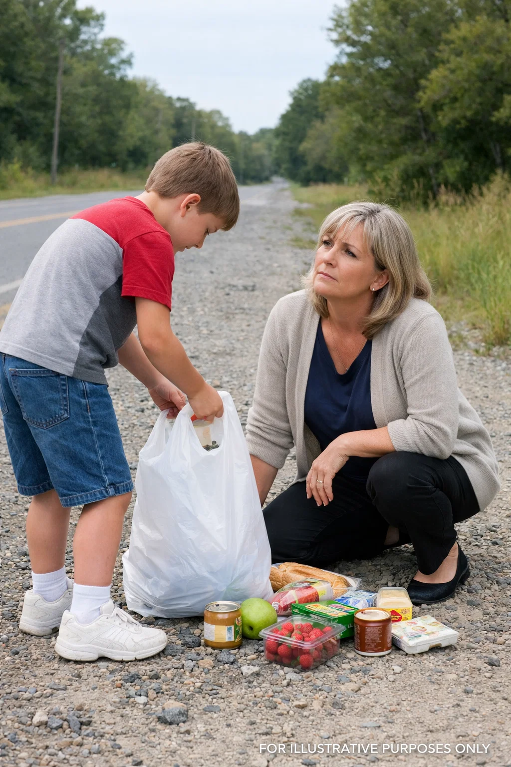 A woman lay near the edge of the road, half on the grass, half on the gravel shoulder. A grocery bag had split open beside her. An apple had rolled down the slope. She was down on one knee, one hand pressed to the ground, her shoulders trembling—not from cold, but from something deeper.