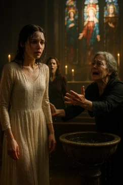 Every footstep echoed against the tile floor, my heart matching its rhythm. She stopped at the edge of the baptismal, her face pale, trembling. Then she looked at me.