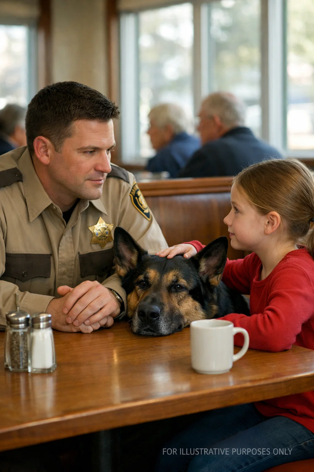 In the far corner of the diner, a small girl in a red shirt and ponytail watched him intently, her eyes wide and thoughtful. Beside her was the massive German Shepherd, still and alert, his gaze fixed on the officer as if studying him. The girl stood up. She wasn’t more than ten.
