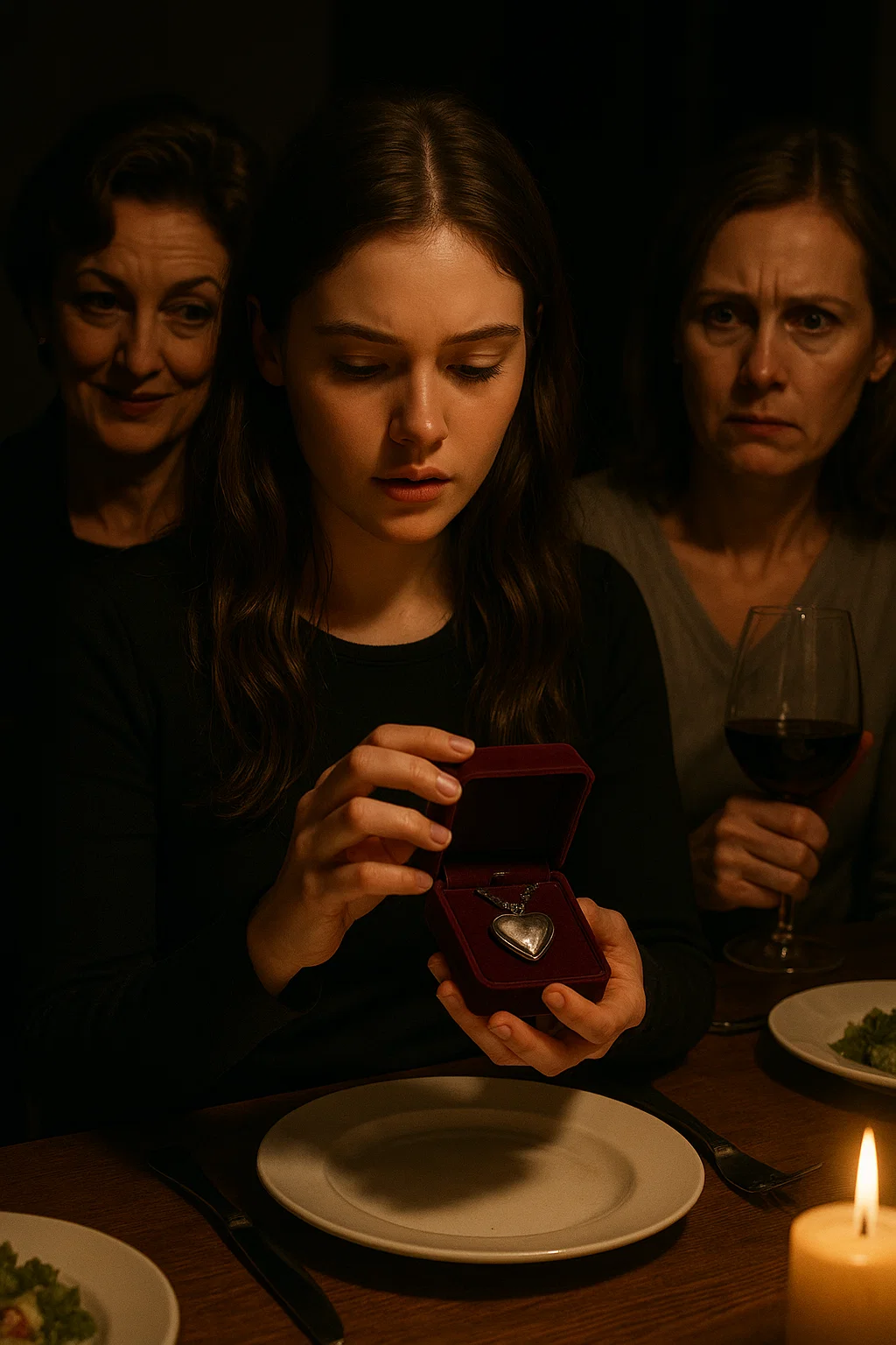 The box was elegant, old-fashioned, with fading gold trim. Inside lay a silver chain with a heart-shaped pendant, the kind you could open and tuck a photo into. It gleamed under the soft dining room lights.
