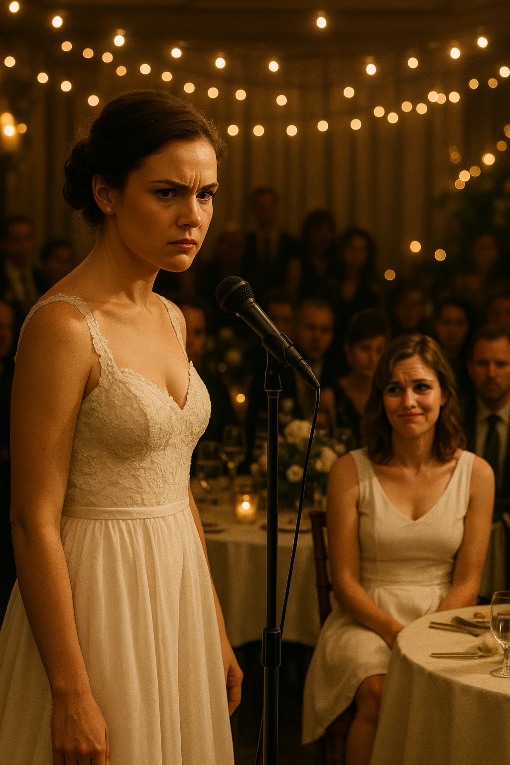 The climax came during the reception. I finally snapped. I walked over to her table, my gown swishing behind me, my patience gone. “Why are you wearing that?” I demanded, my voice trembling. She blinked innocently, twirling her wine glass. “What? This? It’s not even a wedding dress. It’s just formal.” My jaw clenched. “It’s white. At my wedding.” She shrugged, smirking. “It’s just a coincidence. Don’t make it a big deal.” Gasps rose from nearby tables. Her words were so casual, so cruel, I wanted to scream. But instead, I turned, lifted my microphone, and said to the entire room, “Thank you all for being here to celebrate us. And Marissa—thank you for showing everyone exactly what kind of person you are.” The room erupted in whispers. Her smirk faltered. For once, she wasn’t in control.