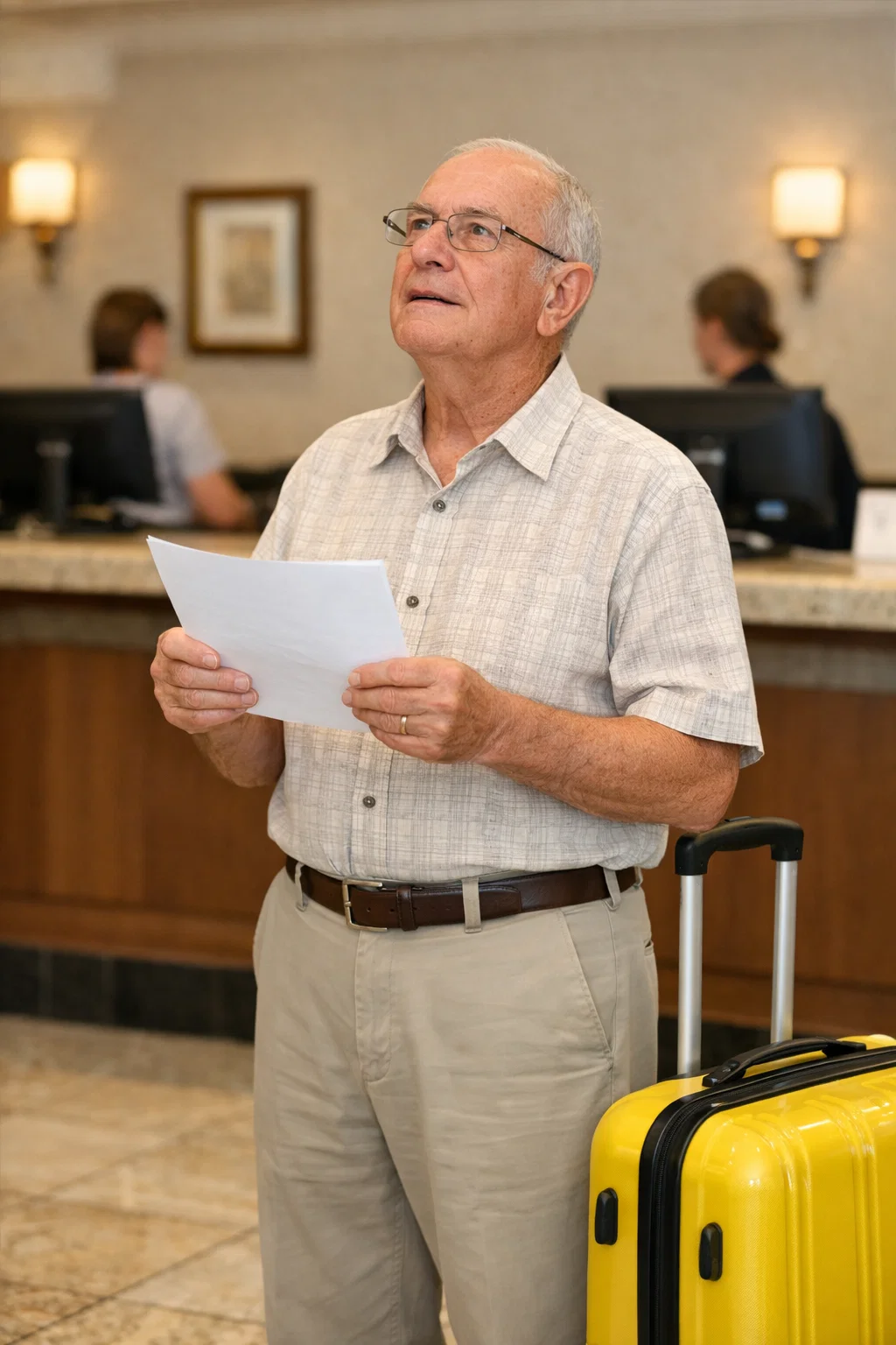 The front doors slid open. My shoes hit the tile. The air smelled like sunscreen and lobby flowers. Behind the counter, I saw him—my grandfather. He was standing still, shoulders slumped, holding a thick piece of paper in both hands. It shook a little.