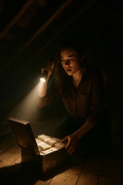 That night, I climbed the creaky stairs to the attic. The air was thick with dust, the beams casting long shadows in the light of my flashlight. I found the east window, its glass cracked in one corner, and knelt on the wooden planks. My hands searched for gaps, my fingers raw against the rough boards, until I felt it—a loose one. I pried it up, my heart hammering.