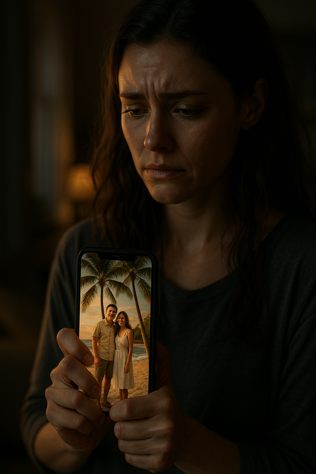 Two days later, my phone buzzed. A friend had tagged me in a photo online. My stomach flipped when I saw it—a beach. Not Chicago. Bright blue water, white sand, palm trees swaying. I stared harder, my pulse pounding. There, in the background, blurry but unmistakable, was him.
