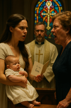 The room went silent. Guests shifted uncomfortably in their pews. My hands tightened around my baby, my heart pounding so loud I thought I’d faint.