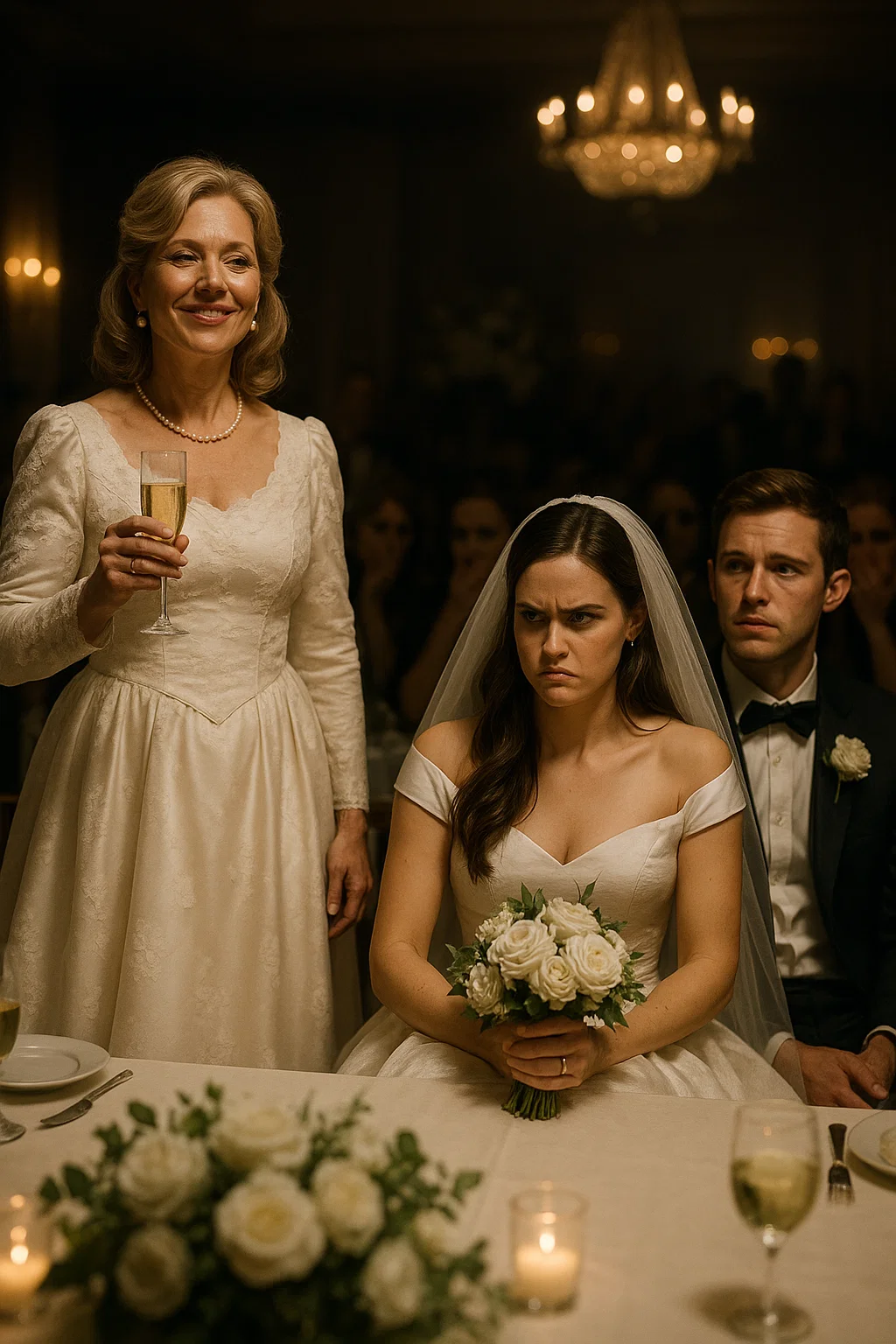 The room was so silent I swear you could hear the clink of cutlery being set down. Patricia’s face hardened. She excused herself, chin high, and swept out of the hall—lace gown trailing behind her like the tail of a retreating bride.
