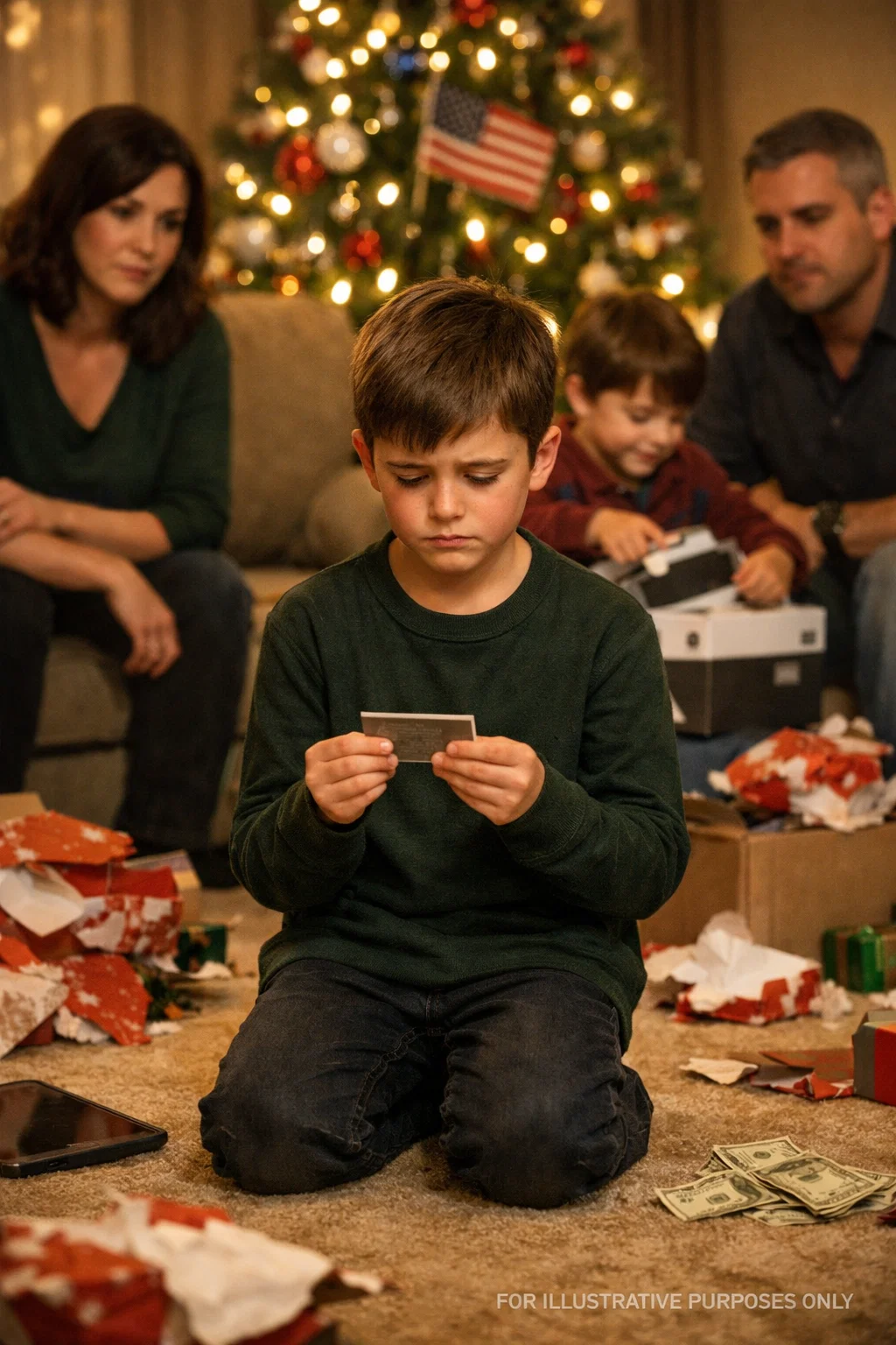 The plastic on the PS5 made a sound like applause when my nephew tore it open, that sharp celebratory rip that cuts through a room before anyone has decided how they feel about it. The sound landed right as my father placed a ten-dollar gas station gift card into my son’s hands, and for a second the timing felt choreographed, like something out of a bad daytime show where the audience gasps on cue. We were sitting in my parents’ living room in the suburbs outside Chicago, the one with the cream carpet that no one is allowed to wear shoes on, even though everyone spills cranberry sauce on it every single year. The Christmas tree glittered with fake snow and dollar-store ornaments that had been around since I was a kid. My sister’s son, Carter, already had a new iPad balanced on his knees, and I noticed an envelope thick with cash tucked carefully under his leg, like someone was afraid it might crawl away if left unattended. Someone had tied a blue ribbon around the PS5 box, looping it twice like you would if the gift were a living thing, a puppy or something that needed to be presented gently.