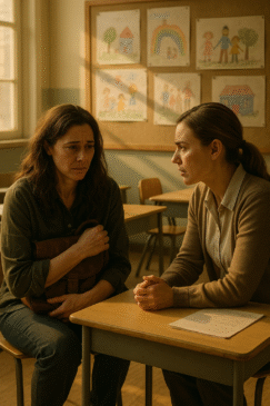 She was waiting in the classroom, papers stacked neatly on her desk, sunlight streaming through the blinds in sharp lines. My son’s artwork hung on the bulletin board—colorful crayon drawings that suddenly felt like relics from a simpler time.